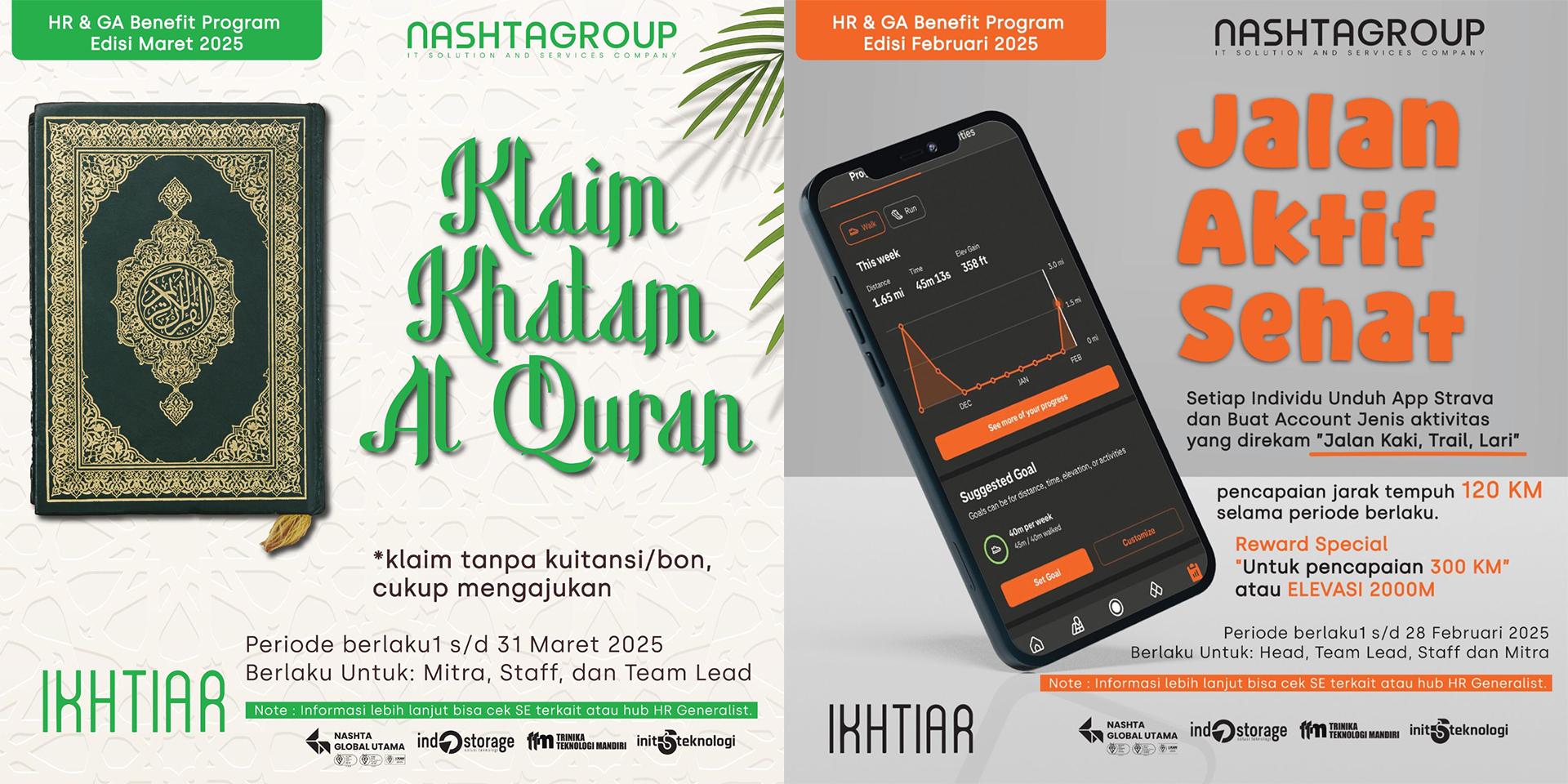 Depok, Karyawan jadi sehat kok dapat hadiah dari perusahaan? Pertanyaan ini sempat terbesit pas pimpinan NashTa Group merilis program Februari berupa jalan atau lari sejauh 120 kilometer atau elevasi 2.000 meter bagi NashTaZen (panggilan karyawan NashTa Group) yang melampauinya. Cuma disuruh jalan atau lari pake aplikasi strava, terus di akhir bulan buktinya diserahkan ke manajemen. Semudah itu? Eits, tapi ternyata gak semua lulus. Hanya ada beberapa karyawan yang konsisten sejak program dirilis. Dengan komitmen yang tinggi, 120 kilometer selama 28 hari pun terlewati. Bahkan, bisa mencapai 300 kilometer, lho! Masya Allah, luar biasa.