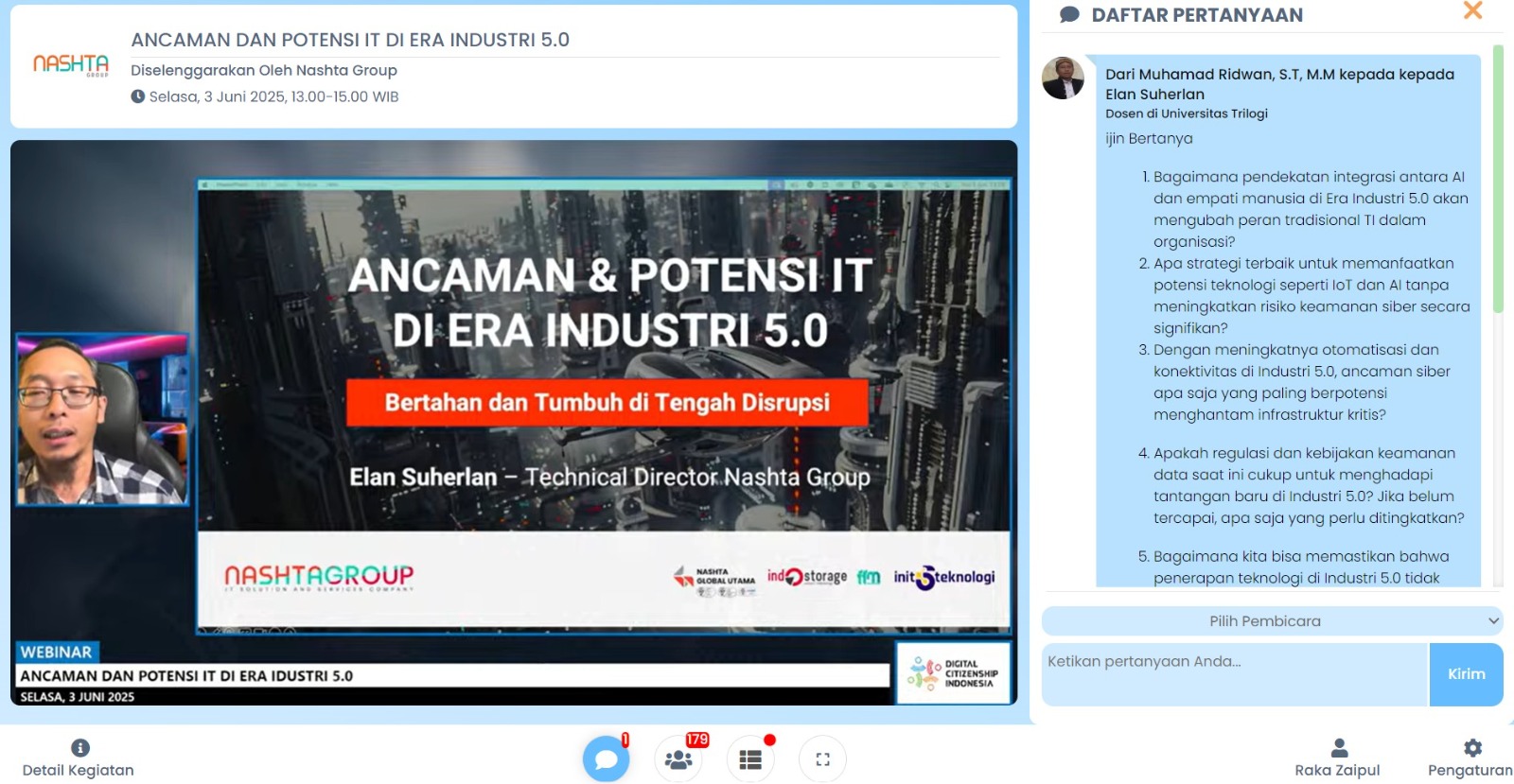 Sebagai bentuk komitmen dalam mendukung transformasi digital yang berkelanjutan, NashTa Group bekerjasama dengan Cloud Computing Indonesia menyelenggarakan webinar bertajuk “Ancaman dan Potensi IT di Era Industri 5.0.” Acara ini dihadiri lebih dari 400 peserta dari berbagai kalangan, mulai dari profesional IT, pelaku bisnis, pejabat pemerintah, akademisi, hingga mahasiswa dari berbagai daerah di Indonesia.