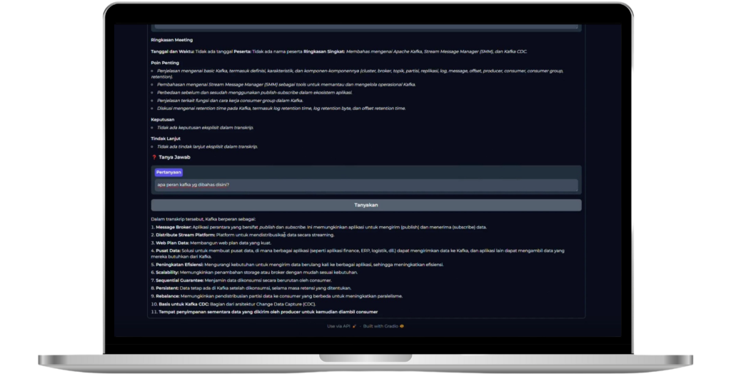 Mulai dari otomatisasi transkripsi, summarization bahasa Indonesia, pencarian notulen berbasis chatbot AI, hingga integrasi dengan workflow dan platform kolaborasi yang sudah digunakan, solusi ini membantu perusahaan: